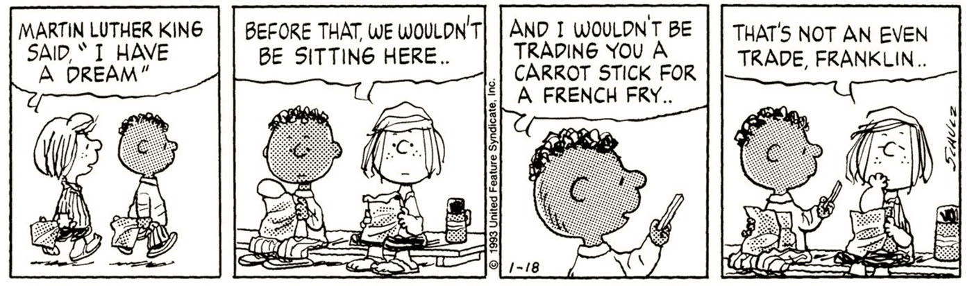 "Schulz understood the tightrope he had to walk because of earlier offensive portrayals of blacks in the media. So he made a deliberate choice not to give Franklin any of the negative traits that plagued the other Peanuts characters." Well, nobody said that it would be easy. Clarence Page, Chicago Tribune columnist put it this way (via):