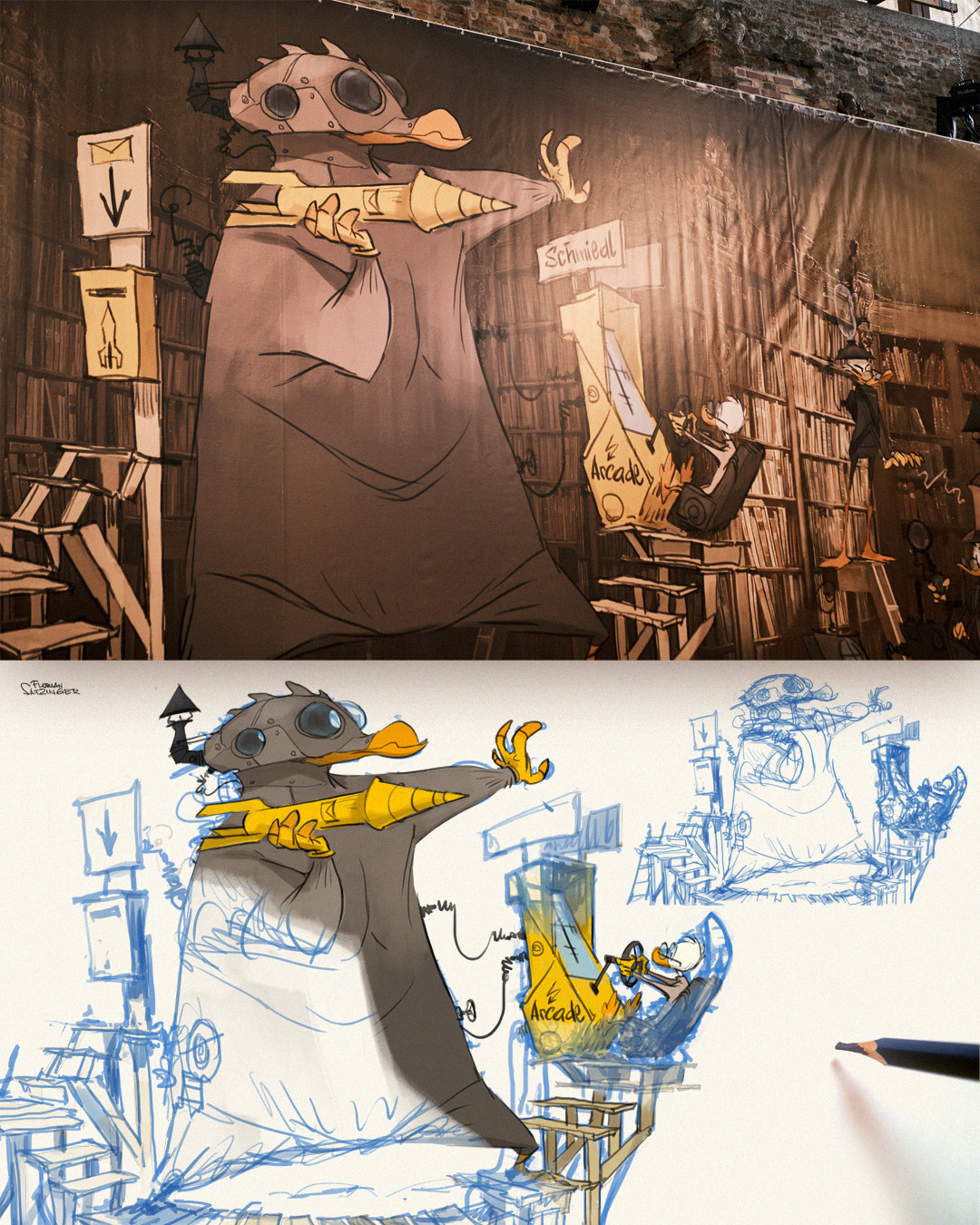 However, during this very time, for the simple pleasure of it, I did this speed colour sketch, spoofing one of Universal Studios' and Zanuck's most noted films, JAWS. I remember that the film poster's iconic colours and layout kind of jumped over to my wacky sketch almost by itself.